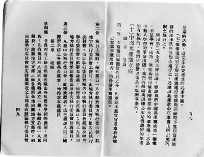 黨的章程,沿用條文形式,分為黨員、組織、會議、紀律、經費、附則,計六章、二十九條,約三千余字。關于黨員條件,規定的是承認黨的宣言和章程并忠實為本黨服務者。與此相聯系的有:必須編入一個組織、參加黨的工作以及交納黨費等。關于組織、會議等也都有可行的具體規定,其中,最重要的是宣布全國代表大會為最高機關,大會閉會期間中央執行委員會為最高機關,從此奠定了中共中央領導制度的框架。此外,還包括有黨籍制度、組織構建、會議辦法等等。