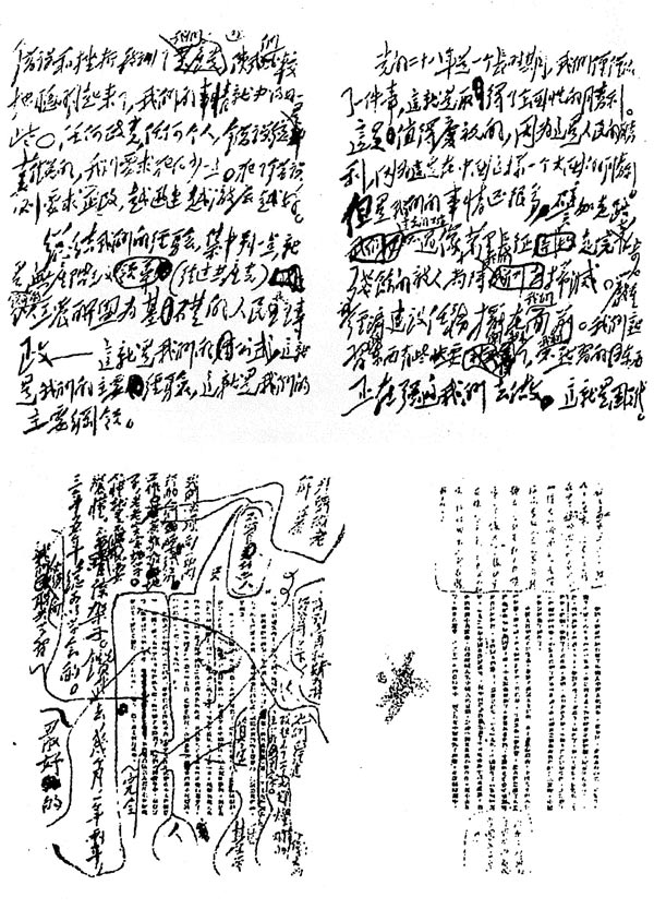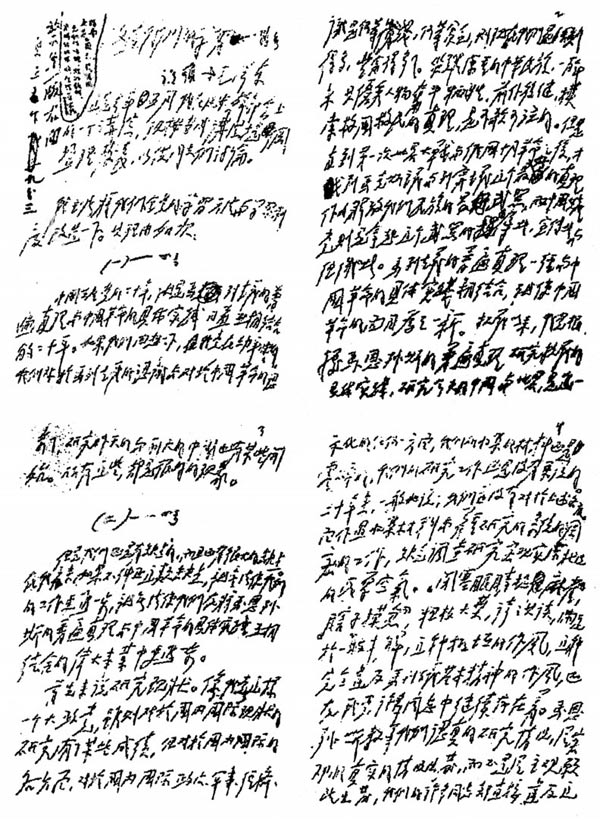 4.《改造我們的學習》(1942年5月19日)。這是毛澤東關于延安整風的重要著作之一。當時毛澤東在延安干部會上講演時,只寫了一個提綱,這篇文章的手稿是他按照講演提綱親自加以整理的,全文18頁,用的是16開紙,是用鉛筆橫寫的,圖五是這篇手稿的前4頁。