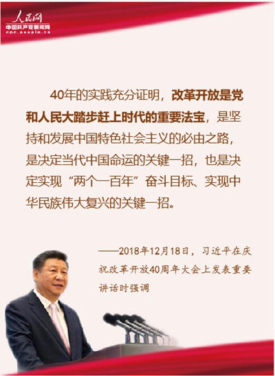 40年的實踐充分證明,改革開放是黨和人民大踏步趕上時代的重要法寶,是堅持和發展中國特色社會主義的必由之路,是決定當代中國命運的關鍵一招,也是決定實現“兩個一百年”奮斗目標、實現中華民族偉大復興的關鍵一招。