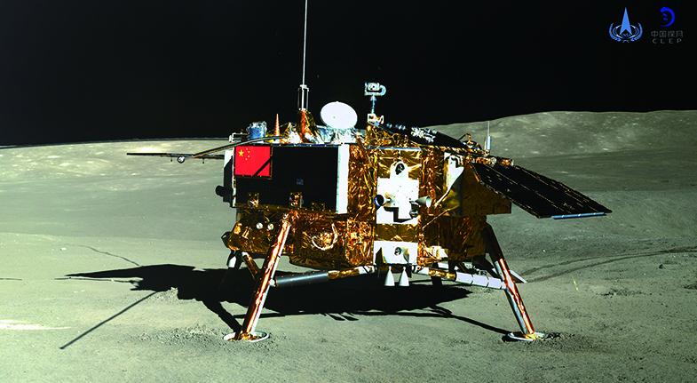 2019年1月3日10時26分,嫦娥四號探測器成功著陸在月球背面東經177.6度、南緯45.5度附近的預選著陸區——南極-艾特肯盆地馮·卡門撞擊坑。此次任務實現了人類探測器首次月背軟著陸、首次月背與地球的中繼通信,開啟了人類月球探測新篇章。圖為2019年1月11日,玉兔二號巡視器全景相機對嫦娥四號著陸器成像。 新華社發國家航天局供圖