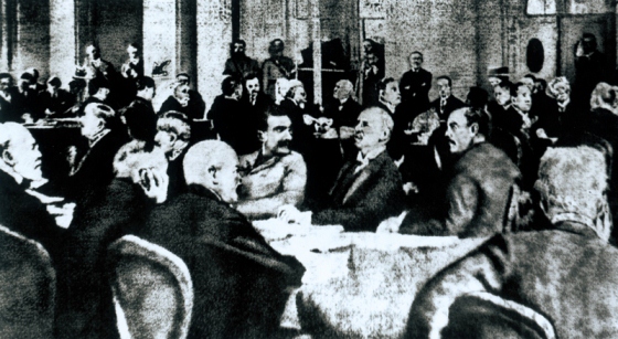近代以來,帝國主義列強的侵略使中國逐步淪為半殖民地國家,帝國主義和中華民族的矛盾成為近代中國社會的主要矛盾之一。1919年1月,第一次世界大戰戰勝國在法國巴黎召開和會,把持和會的英法美等列強無視中國也是戰勝國之一,不顧中國民眾呼聲,竟然決定將戰敗國德國在中國山東的權益轉讓給日本。在巴黎和會中,中國政府的外交失敗,激起了中國民眾的強烈不滿,從而引發了五四運動。圖為巴黎和會會場。北京新文化運動紀念館供圖