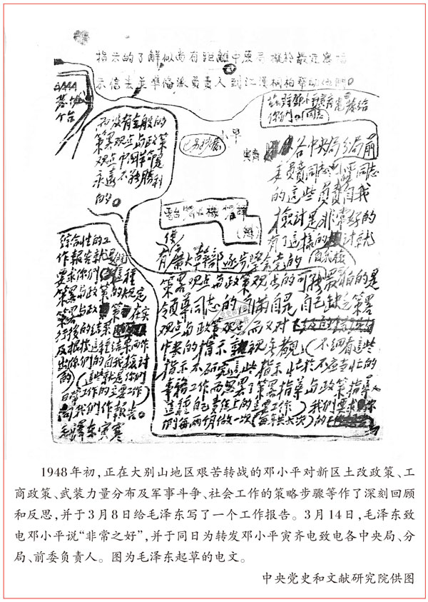 當(dāng)年3月14日,毛澤東在收到鄧小平3月8日關(guān)于新解放區(qū)全盤的策略與政策問(wèn)題給中共中央的報(bào)告后,批示向各中央局、分局、前委轉(zhuǎn)發(fā)鄧小平的報(bào)告,批語(yǔ)中給予報(bào)告高度評(píng)價(jià),同時(shí)指出:“要求你們每?jī)蓚(gè)月做一次(每年共六次)的綜合性的工作報(bào)告,就是要求你們將這種策略與政策的規(guī)定、策略與政策在實(shí)行后的結(jié)果及根據(jù)這種結(jié)果而作出的你們的自我檢討(這些就是你們?nèi)粘9ぷ鞯闹饕ぷ鳎┫蛭覀冏鲌?bào)告。”