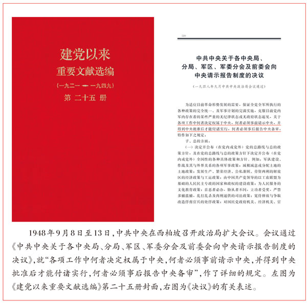 同年9月,毛澤東在西柏坡主持召開(kāi)中共中央政治局會(huì)議,會(huì)議通過(guò)了《中共中央關(guān)于各中央局、分局、軍區(qū)、軍委分會(huì)及前委會(huì)向中央請(qǐng)示報(bào)告制度的決議》(簡(jiǎn)稱《決議》)!稕Q議》就各項(xiàng)工作中何者決定權(quán)屬于中央,何者必須事前請(qǐng)示中央,并得到中央批準(zhǔn)后才能付諸實(shí)行,何者必須事后報(bào)告中央備審,作了詳細(xì)的規(guī)定,從而正式確立了包括綜合報(bào)告和其他各項(xiàng)工作報(bào)告在內(nèi)的一整套完備的請(qǐng)示報(bào)告制度,同時(shí)也明確了黨的各級(jí)組織的權(quán)限和責(zé)任擔(dān)當(dāng)。