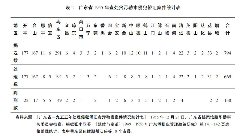 表2 統計情況為: 1955 年廣東全省各市縣查處貪污勒索侵犯僑匯案件共794 宗; 處理669宗,批評反省警告或調解處理520 宗,撤職開除黨團籍11 宗,判刑138 宗( 其中死刑8 宗,無期徒刑3 宗,半年至15 年有期徒刑125 宗,扣押2 宗) 。可見廣東省侵犯僑匯現象之普遍,尤其是重點僑鄉開平、臺山及潮汕等地更甚; 從查處情況也可以反映出廣東省執行國務院保護僑匯政策命令態度之堅決、力度之大、處理之嚴厲。