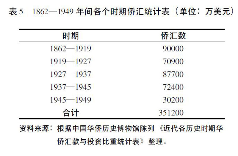 從表5 統計可見,舊中國從1862 年至1949 年共87 年間僑匯總數為35 億多美元,再從前面表4 統計顯示的新中國成立后30 年( 1950—1980 年) 僑匯總數為近76 億美元,即新中國30 年僑匯數是舊中國87 年僑匯的兩倍多。通過比較,可以看出新中國僑匯工作取得的顯著成績。