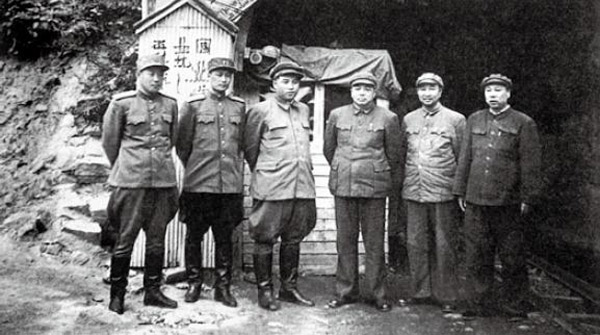 1951 年秋,中朝將領在志愿軍司令部門外合影。左起:柳京珠、樸一禹、金日成、彭德懷、陳賡、甘泗淇