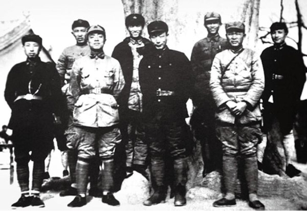 1937 年春,紅一軍團(tuán)和紅十五軍團(tuán)部分干部在陜西淳化縣合影。右起:鄧小平、徐海東、陳光、聶榮臻、程子華、楊尚昆、羅瑞卿、王首道