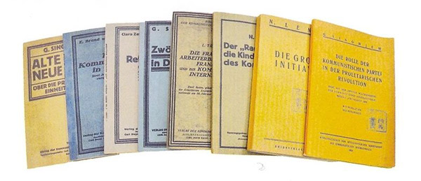 未名湖畔的北京大學(xué)圖書館一樓典藏部里,保存著八本珍貴的外文書籍。這些書都是32開印刷精美的德文原版小冊(cè)子,封面有橘紅、淡藍(lán)等顏色,每本書的封面上,都有一枚“亢慕義齋藏書”的印章。這是八本極為珍貴的德文原版馬克思主義文獻(xiàn),有列寧的《偉大的創(chuàng)舉》《共產(chǎn)主義運(yùn)動(dòng)中的左派“幼稚病”》,季諾維也夫的《共產(chǎn)黨在無產(chǎn)階級(jí)革命中的作用》《德國十二天》《舊目標(biāo)新道路》,托洛茨基的《法國工人運(yùn)動(dòng)問題和共產(chǎn)國際》,蔡特金和瓦勒齊的《反對(duì)改良主義》,布蘭特和瓦勒齊的《共產(chǎn)主義在波蘭》。封面的下方,分別印有“漢堡共產(chǎn)國際出版社”等字樣。印刷出版時(shí)間分別為1920年、1921年及1922年。