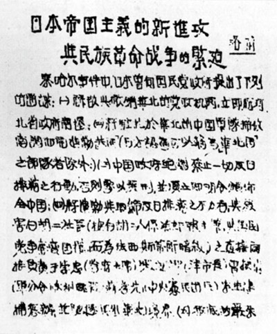 張聞天(洛甫)所寫《日本帝國主義的新進攻與民族革命戰爭的緊迫》