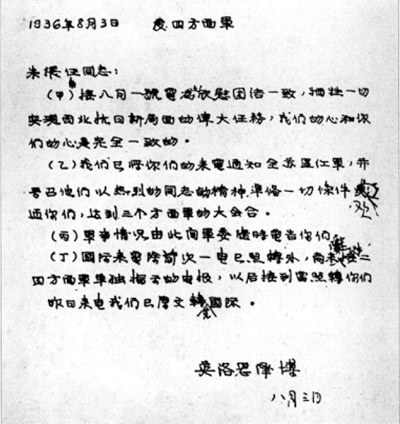 張聞天同林育英(張浩)、周恩來、毛澤東、博古聯名致朱德、張國燾、任弼時的電報