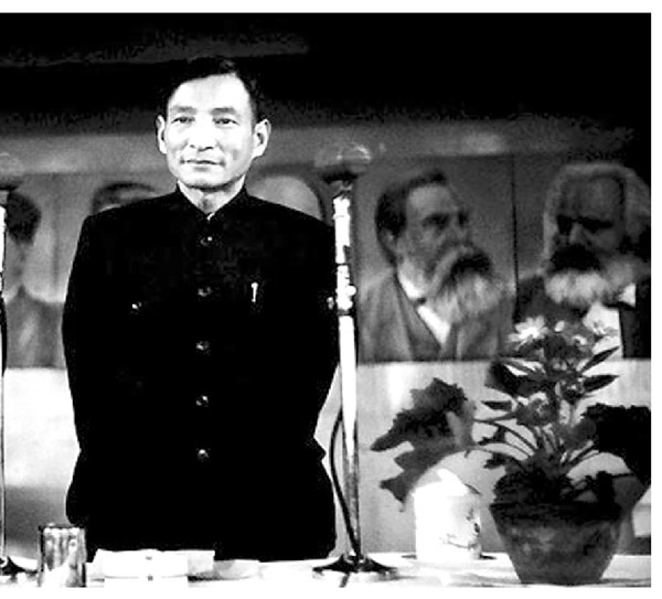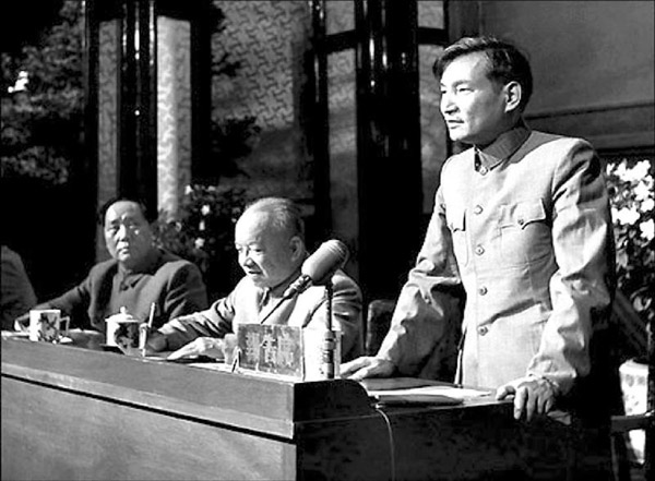 1 9 5 4 年6月17日,陳云在中央人民政府委員會第31次會議上作關于國家財政預算問題的報告,左一為毛澤東