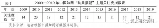 表1是2009—2019年中國(guó)知網(wǎng)“抗美援朝”主題關(guān)注度指數(shù)表,從表中數(shù)據(jù)可以看出,關(guān)注度指數(shù)較高的年份是2010年、2013年和2019年,都在20以上,這是因?yàn)?/span>2010年和2013年分別是中國(guó)人民志愿軍抗美援朝出國(guó)作戰(zhàn)60周年、抗美援朝戰(zhàn)爭(zhēng)勝利60周年,2019年是新中國(guó)成立70周年,因此這三年的關(guān)注度指數(shù)相對(duì)較高,其他年份的關(guān)注度指數(shù)相對(duì)較為平穩(wěn),基本保持在10-15的中等區(qū)間內(nèi),比之前10年平均指數(shù)6.6有大幅度提高。2020年是中國(guó)人民志愿軍抗美援朝出國(guó)作戰(zhàn)70周年,預(yù)計(jì)關(guān)注度指數(shù)也會(huì)有較大提升。