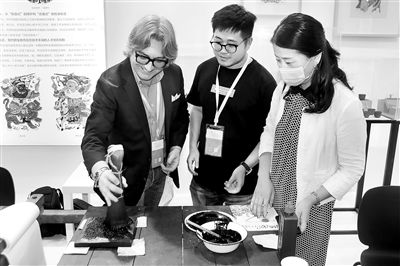 在今年舉行的第九屆蘇州“創博會”上,一名外國參觀者在體驗木刻印刷。
