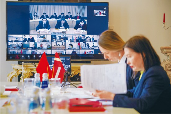 2020年3月13日,中國同中東歐17國舉行新冠肺炎疫情防控專家視頻會議,分享和交流疫情防控經驗及信息。這是中國秉承人類命運共同體理念,為全球公共衛生安全事業作貢獻的重要舉措。圖為在拉脫維亞首都里加,拉脫維亞衛生專家在中國駐拉使館參加視頻會議。 新華社發 亞尼斯/攝
