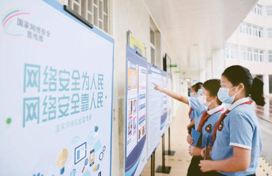 2020年9月14日,河北省石家莊市橋西區草場街小學的學生在觀看網絡安全知識展板。 新華社記者 王曉/攝