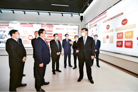 2020年11月12日,浦東開發開放30周年慶祝大會在上海市舉行。中共中央總書記、國家主席、中央軍委主席習近平在會上發表重要講話。這是當天上午,習近平等參觀“在國家戰略的引領下——浦東開發開放30周年主題展”。 新華社記者 殷博古/攝