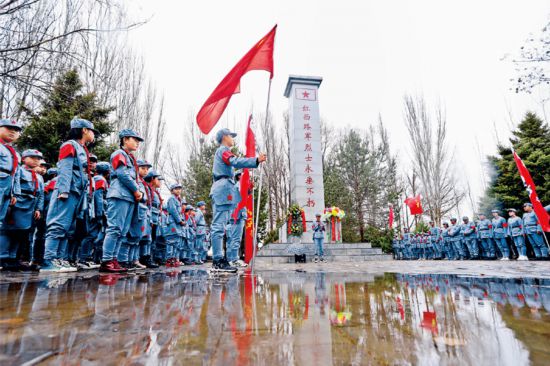 甘肅省張掖市龍渠烈士陵園掩埋著20世紀30年代中國工農紅軍西路軍英勇西征時犧牲的烈士遺骨。圖為2021年3月31日,龍渠鄉中心學校師生在烈士陵園緬懷革命先烈。 人民視覺 王將/攝