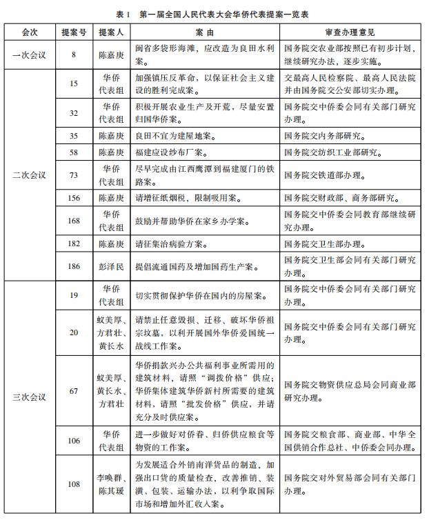 為了全面反映華僑代表建言獻策情況,現(xiàn)將他們在各次會議上的提案整理如下,作為補充(見表1)。
