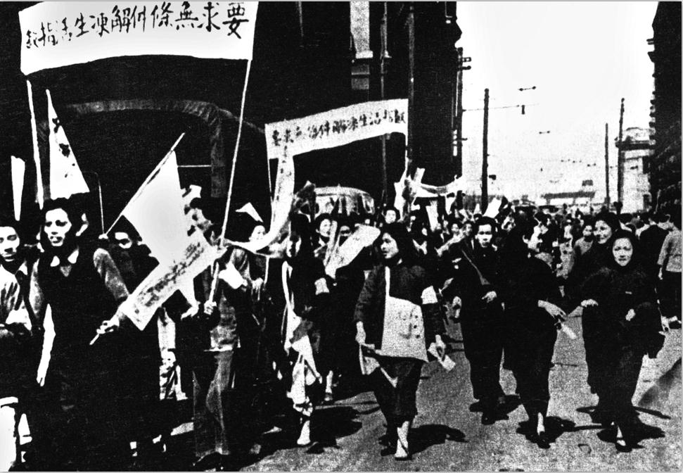 為什么英國能這樣欺負中國人?同學(xué)們感到就是因為國民黨政府實行的是屈辱的奴才外交。當(dāng)隊伍轉(zhuǎn)到南京路上游行時,群情激昂,還用“打倒列強,除軍閥”的曲調(diào)唱起“奴才外交,要反對;反動政府,要垮臺”的歌來。我在游行隊伍里,很幼稚,也很興奮。跟著唱,覺得能在南京路上高唱“反動政府要垮臺”,十分解氣。這種情景,至今歷歷如在眼前。有些同學(xué)還用柏油把呼喊的口號寫在外灘和南京路的大樓墻上,那是很難擦去的。這種自發(fā)行動是過激的,不僅暴露自己,而且容易換來軍警的武裝鎮(zhèn)壓。但國民黨當(dāng)局事前并無準(zhǔn)備,最激烈的口號是在從外灘轉(zhuǎn)到南京路游行時喊出和唱出來的,游行隊伍走到南京路西藏路口就解散了,時間不長,他們也分不清誰在唱誰在寫,所以難以立刻動手,但強烈的反應(yīng)很快就來了。