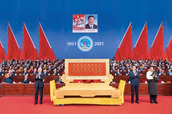 8 月19 日,慶祝西藏和平解放70 周年大會在拉薩隆重舉行。中共中央政治局常委、全國政協主席、中央代表團團長汪洋向西藏自治區、西藏軍區、武警西藏總隊、西藏自治區政法系統、中國佛協西藏分會分別贈送了中共中央總書記、國家主席、中央軍委主席習近平題詞的“建設美麗幸福西藏 共圓偉大復興夢想”賀匾和賀幛 黃敬文攝/ 本刊