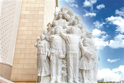 圖為中國共產黨歷史展覽館主題雕塑作品《信仰》。這組群像雕塑以標志性的歷史事件、人物和成就等為背景元素,形象再現了中國共產黨員莊嚴宣誓的場景。 (圖片來源:人民視覺)