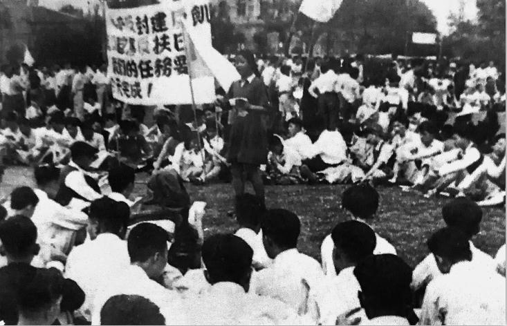 5月4日,全市1.5萬名學生在交大民主廣場舉行篝火晚會,也請孟憲章教授做“反美扶日”的主題報告,會上宣布成立“上海市學生反對美國扶植日本、搶救民族危機聯合會”。我也去參加了。5月30日起,復旦的反美扶日運動走向高潮。5月30日是個星期日,這天400多名復旦同學組成30多個小隊,到南市和上海美專、立信會計學校等進行宣傳和演出,收到良好效果。