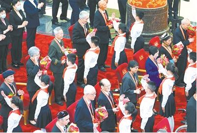 慶祝中國共產黨成立100周年“七一勛章”頒授儀式在北京人民大會堂金色大廳隆重舉行。圖為少先隊員向勛章獲得者獻花,敬禮致意。 新華社記者 高潔 攝