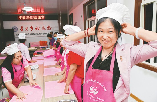 2021年以來,青島膠州市先后在24個(gè)鄉(xiāng)村(社區(qū))扶持打造了35個(gè)村級夜校,開設(shè)育嬰師、面點(diǎn)師、電焊工等“接地氣”的培訓(xùn)課程,幫助村民豐富精神文化生活、提高創(chuàng)業(yè)致富技能水平。圖為2021年8月31日,村民在夜校學(xué)習(xí)中式面點(diǎn)制作。 新華社記者 李紫恒/攝