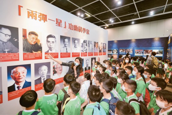 2021年6月27日至7月9日,“時代精神耀香江”之百年中國科學家主題展在香港向公眾開放。圖為7月7日,眾多小學生仔細聆聽講解員的介紹。 中新社記者 張煒/攝