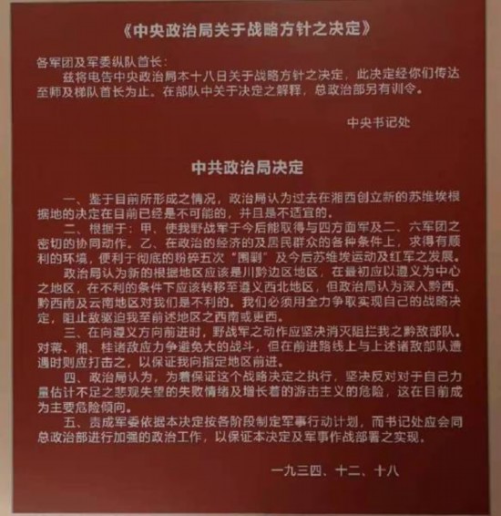 “鑒于目前所形成之情況,政治局認為過去在湘西創立新的蘇維埃根據地的決定在目前已經是不可能的,并且是不適宜的”。