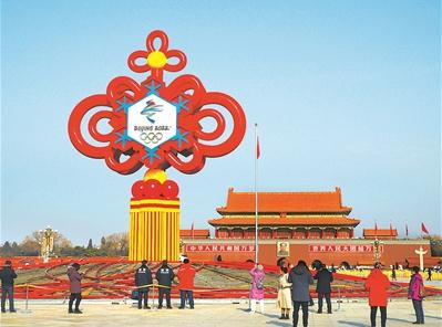 北京冬奧會(huì)是我國(guó)重要?dú)v史節(jié)點(diǎn)的重大標(biāo)志性活動(dòng),是展現(xiàn)國(guó)家形象、促進(jìn)國(guó)家發(fā)展、振奮民族精神的重要契機(jī)。2022年1月14日,北京天安門廣場(chǎng)“精彩冬奧”主題花壇亮相,花壇頂高17米,以中國(guó)結(jié)為主景,結(jié)合冬奧會(huì)會(huì)徽以及冰雪元素,傳達(dá)對(duì)北京冬奧會(huì)美好祝福。(圖片來(lái)源:視覺(jué)中國(guó))