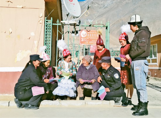 為打通黨的十九屆六中全會精神宣講“最后一公里”,新疆喀什邊境管理支隊庫地邊境派出所組織民警深入轄區抵邊村落、農牧民夜校、施工作業點等進行宣講。圖為2021年12月10日,民警前往距離葉城縣將近300公里的苦魯勒村,在家門口向村民們宣講全會精神。 人民視覺 李展朋/攝
