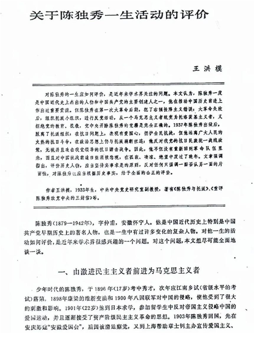 20世紀80年代初,陳獨秀評價問題受到時任中共中央總書記胡耀邦的關注,由王洪模執筆并經中央黨史研究室專家集體討論完成了《關于陳獨秀一生活動的評價》一文,對陳獨秀一生的幾個關鍵問題作出了明確的評述,即:陳獨秀是五四運動的總司令,但不是一個好的馬克思主義者;他是中國共產黨的主要創建人之一和早期主要領導人,但不是一個稱職的領導人;他從新文化運動到第一次大革命中期為革命作出了很大貢獻,但在大革命的一些關鍵時刻犯了嚴重錯誤,并在后期犯了右傾投降主義錯誤,給黨的事業造成嚴重危害等。該文對陳獨秀的歷史貢獻和所犯錯誤都進行了分析和評價。受歷史環境的影響,雖然有些評價仍有些偏頗,但是畢竟較前面的研究,向前邁進了一大步。