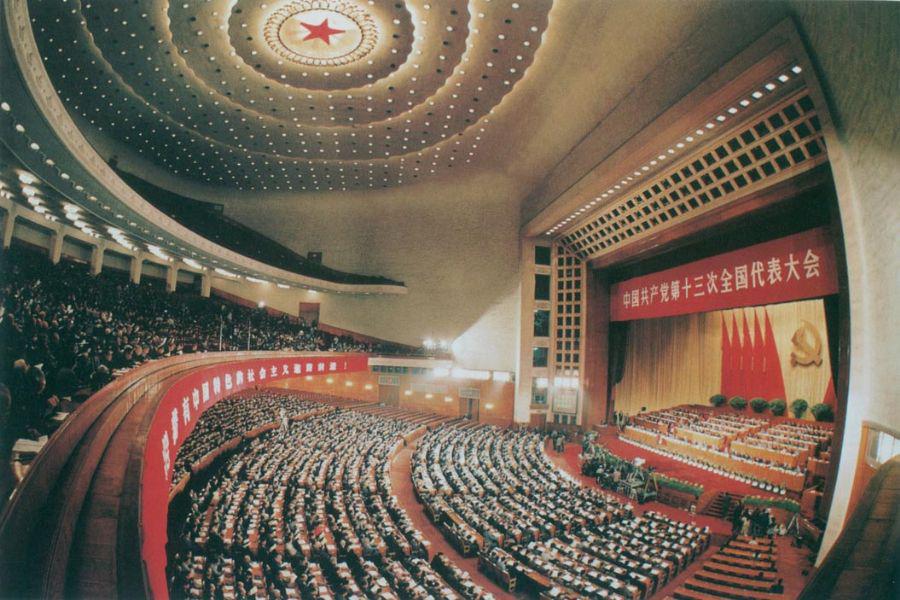 黨的十三大系統論述了社會主義初級階段理論和黨的基本路線,確定分三步走實現現代化的發展戰略。圖為黨的十三大會場。