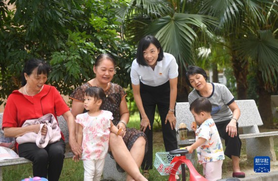 二十大代表、廣東省佛山市禪城區古灶村黨委書記、村委會主任陸秀興(右三)和村民在一起聊天(2022年9月7日攝)。新華社記者 盧漢欣 攝