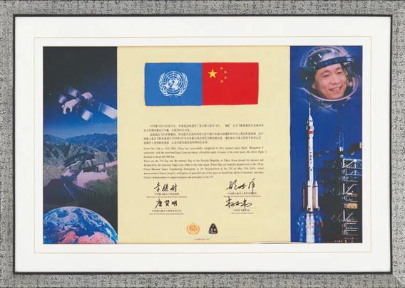 我國航天員楊利偉在太空展示的中國國旗和聯(lián)合國旗