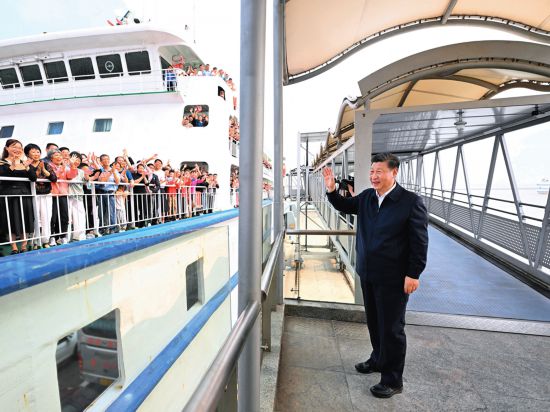 4月10日至13日,中共中央總書記、國家主席、中央軍委主席習近平在廣東考察。這是 10 日下午,習近平在湛江市徐聞縣徐聞港泊位碼頭,向船上的旅客揮手致意 燕雁攝/本刊