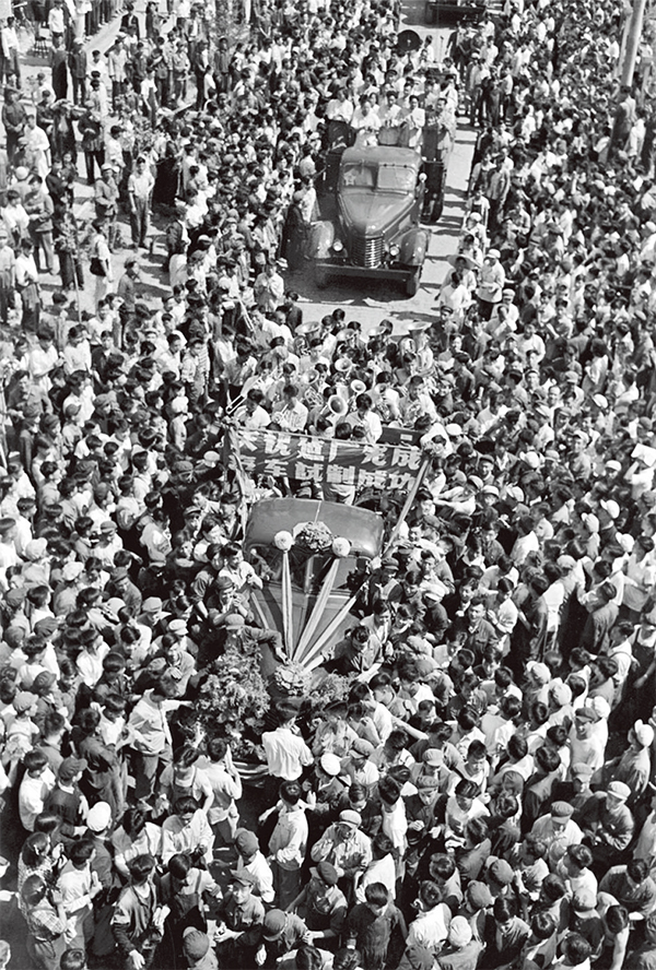 1956年7月15日,長春第一汽車制造廠生產出中國第一輛解放牌汽車,從此結束了中國不能生產汽車的歷史。圖為第一批國產解放牌載重汽車排成長列開出長春第一汽車制造廠的時候,全廠職工夾道歡呼。 新華社發