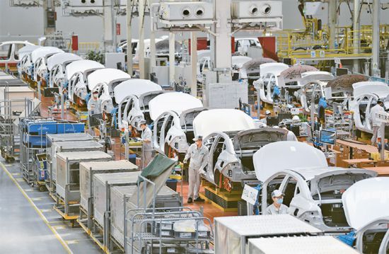 2023年4月12日,習近平總書記來到廣汽埃安新能源汽車股份有限公司考察。他走進企業(yè)展廳、總裝車間、電池生產車間等,了解企業(yè)突破關鍵核心技術和推動制造業(yè)高端化、智能化、綠色化等進展情況。圖為廣汽埃安新能源汽車股份有限公司總裝生產線。 新華社記者 鄧華/攝