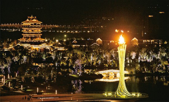 2023年7月28日晚,第31屆世界大學生夏季運動會開幕式在成都東安湖體育公園主體育場舉行。這是成都大運會主火炬。 新華社記者 曹祎銘/攝