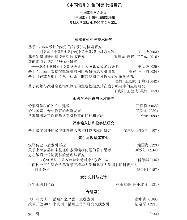 《中國索引》集刊第七輯目錄