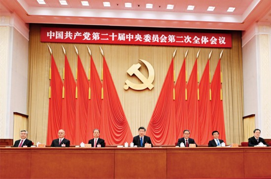 中國共產黨第二十屆中央委員會第二次全體會議,于2023年2月26日至28日在北京舉行。這是習近平、李強、趙樂際、王滬寧、蔡奇、丁薛祥、李希等在主席臺上。 新華社記者 謝環馳/攝