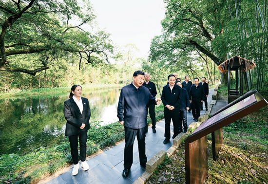 2023年10月10日至13日,中共中央總書記、國家主席、中央軍委主席習近平在江西考察。這是11日下午,習近平在上饒市婺源縣秋口鎮王村石門自然村考察時,了解饒河源國家濕地公園和極度瀕危鳥類藍冠噪鹛保護等情況。 新華社記者 謝環馳/攝