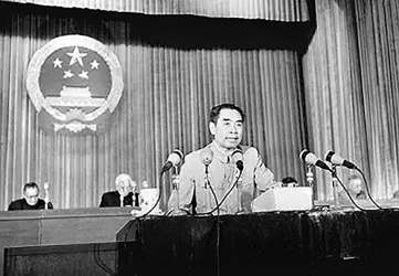 1954年9月,周恩來在一屆全國人大一次會議上作《政府工作報告》,明確提出要把我國建設成為具有強大的現代化的工業、農業、交通運輸業和現代化國防的社會主義國家。