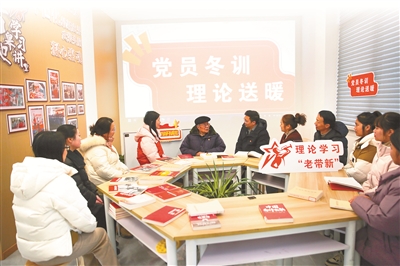 江蘇省如皋市城南街道肖陸村書屋內(nèi),老黨員在微黨課上為青年黨員講述黨史故事。 圖片來源:視覺中國