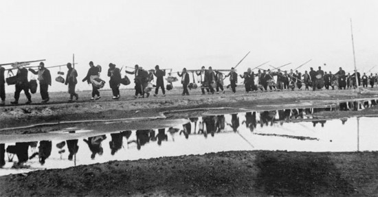人民解放軍以摧枯拉朽之勢奪取三大戰役勝利,根本原因是我們黨同人民一條心、軍民團結如一人。圖為1948年冬淮海戰役期間,渤海區擔架民工趕赴前線。 張韞磊/攝