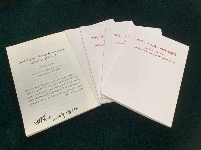 曲青山院長高度重視考察團來訪,要求相關部門做好接待和交流工作,并在所著《中共二十大的一些基本情況》(中、英、阿三種文字對照版)一一親筆簽名,分別贈送給考察團成員。