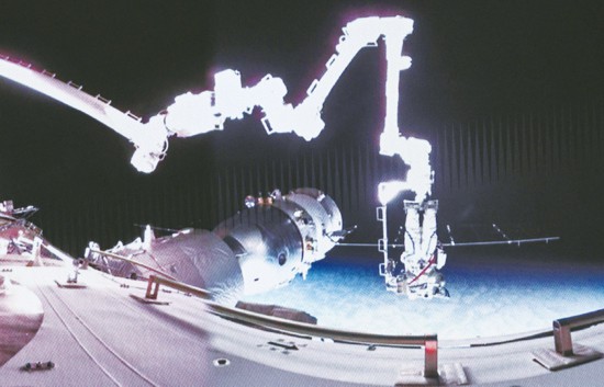 2024年3月2日,神舟十七號航天員乘組第二次出艙活動取得圓滿成功,這是我國航天員首次完成在軌航天器艙外設施的維修任務。圖為在北京航天飛行控制中心拍攝的神舟十七號航天員江新林在空間站機械臂的輔助下進行艙外作業。 新華社記者 李賀/攝