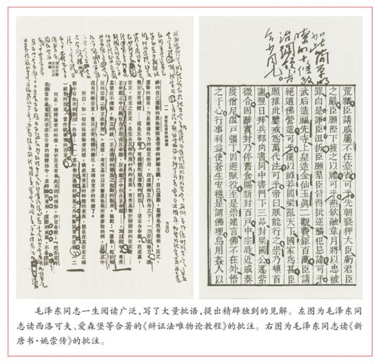 對于哲學書籍,毛澤東同志一生涉獵十分廣泛,既讀馬列經典中的哲學書,也讀艾思奇、李達、普列漢諾夫、愛森堡、西洛可夫、米丁、尤金、河上肇等中外學者的書;既讀柏拉圖、康德、黑格爾、杜威、羅素等西方哲學家的書,也讀中國古代老子、孔子、墨子、莊子、孟子、荀子、韓非子、王充、張載、朱熹、王陽明等的哲學論著以及近代以來康有為、梁啟超、章士釗、楊昌濟、梁漱溟、馮友蘭、潘梓年、周谷城、任繼愈等人研究哲學和邏輯學的論著。