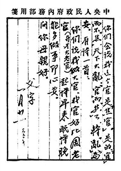 謝覺哉還多次寫信勸孩子們不要來,他說:“你們會說我這個官是‘焦官’(湖南方言,指不掙錢的官)。是的,‘官’而不‘焦’,天下大亂;‘官’而‘焦’了,轉亂為安。”